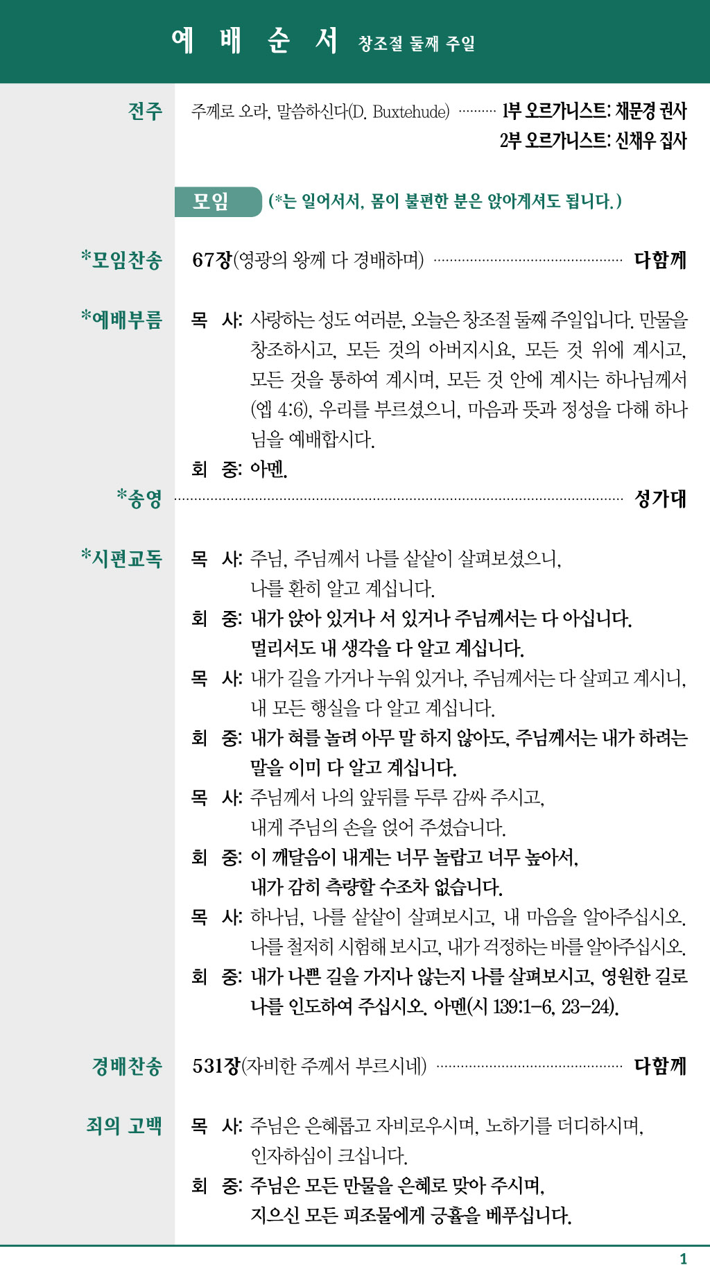 | 전주 | 주께로 오라, 말씀하신다(D. Buxtehude) |