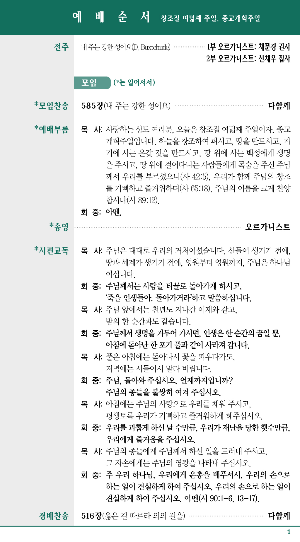 | 전주 | 내 주는 강한 성이요(D. Buxtehude) |