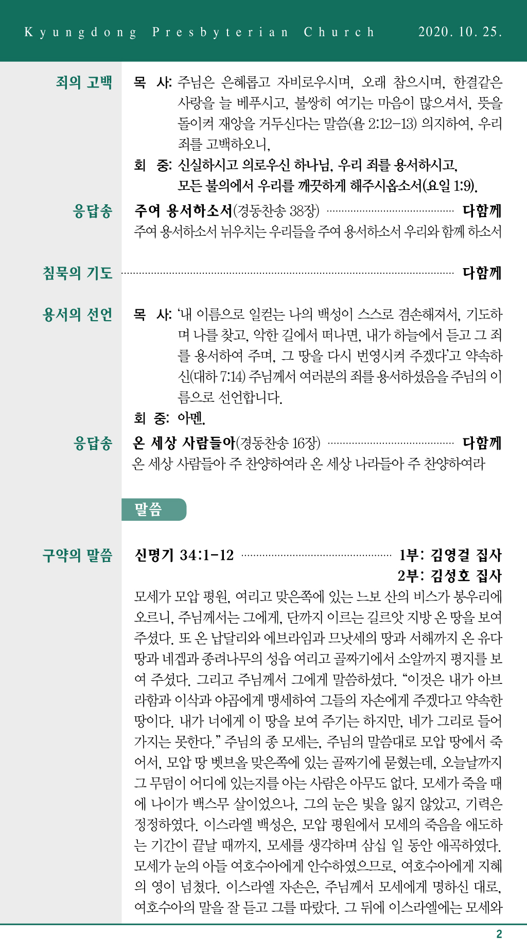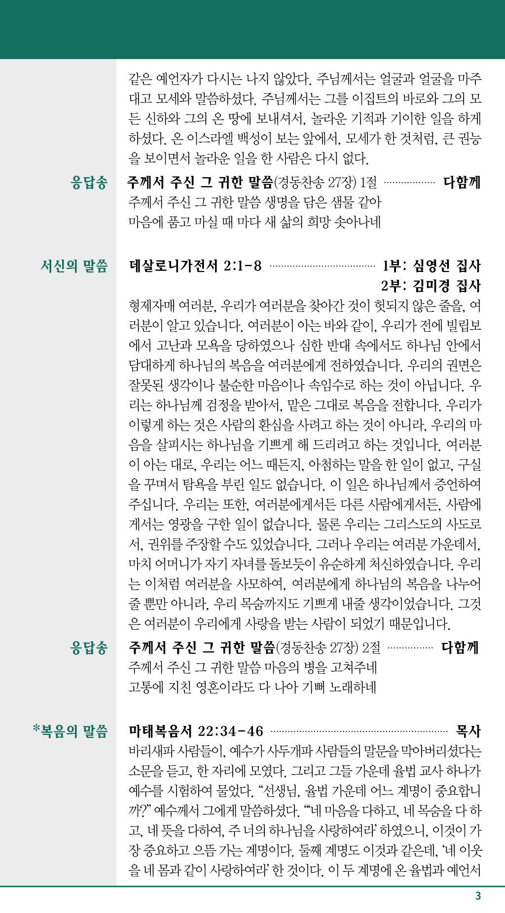 | 성경구절 | 신명기 34:1-12/ 데살로니가전서 2:1-8/ 마태복음서 22:34-46 |