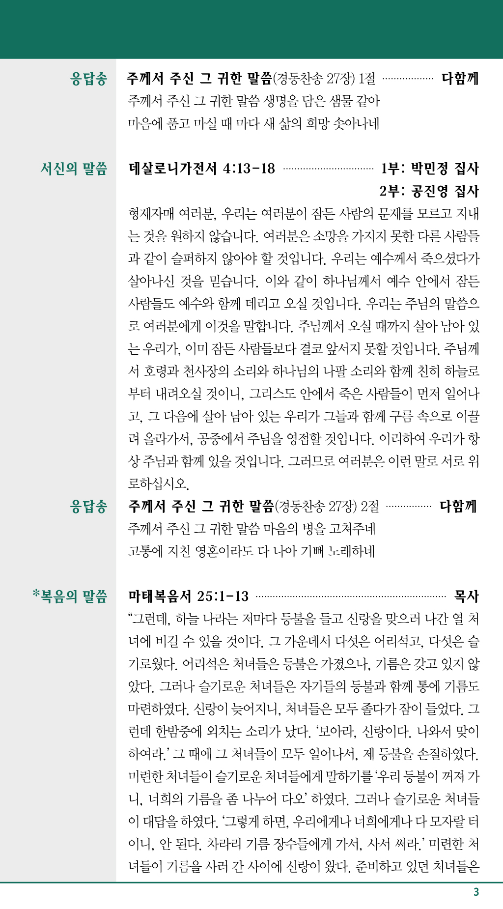 | 성경구절 | 여호수아기 24:14-18/ 데살로니가전서 4:13-18/ 마태복음서 25:1-13 |