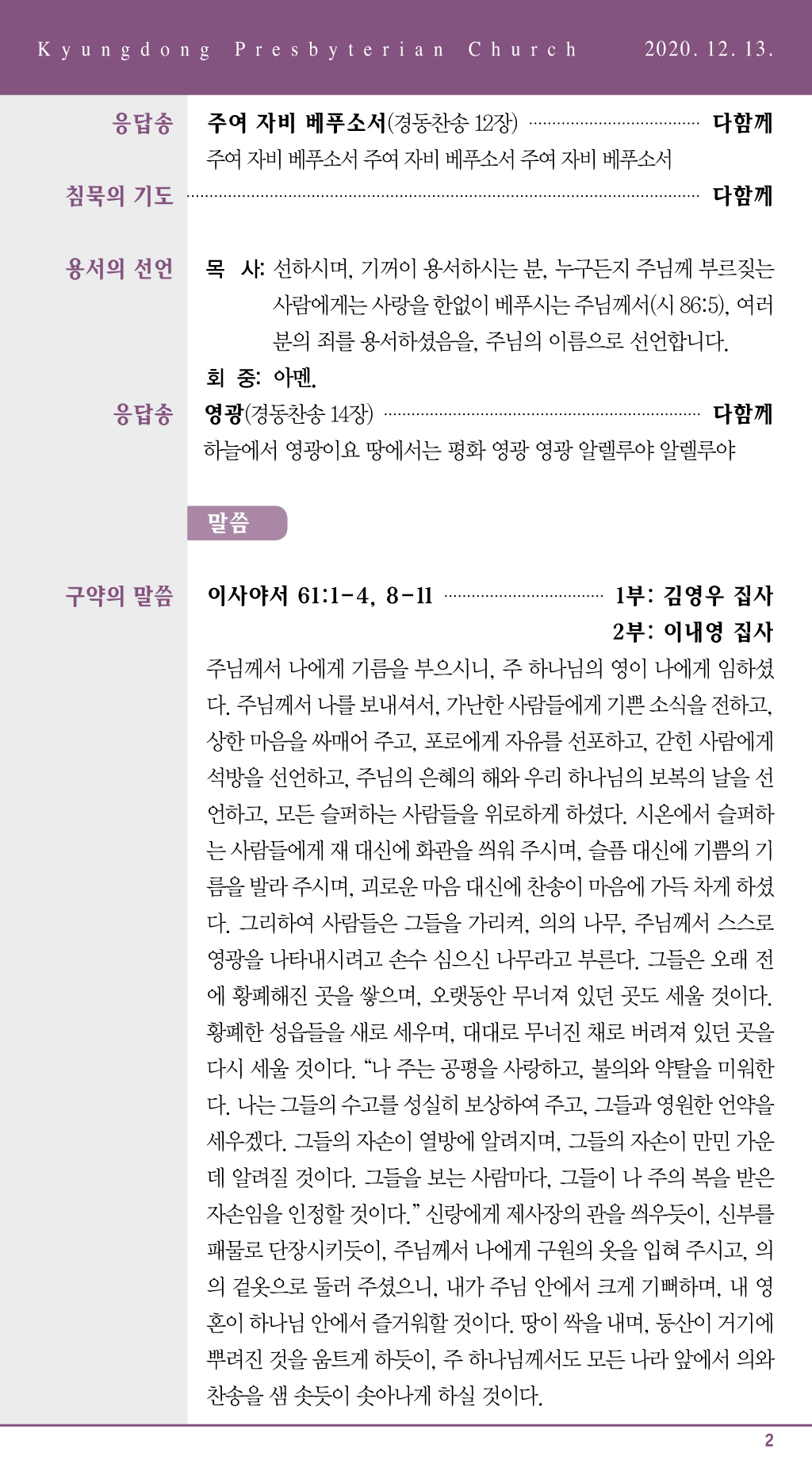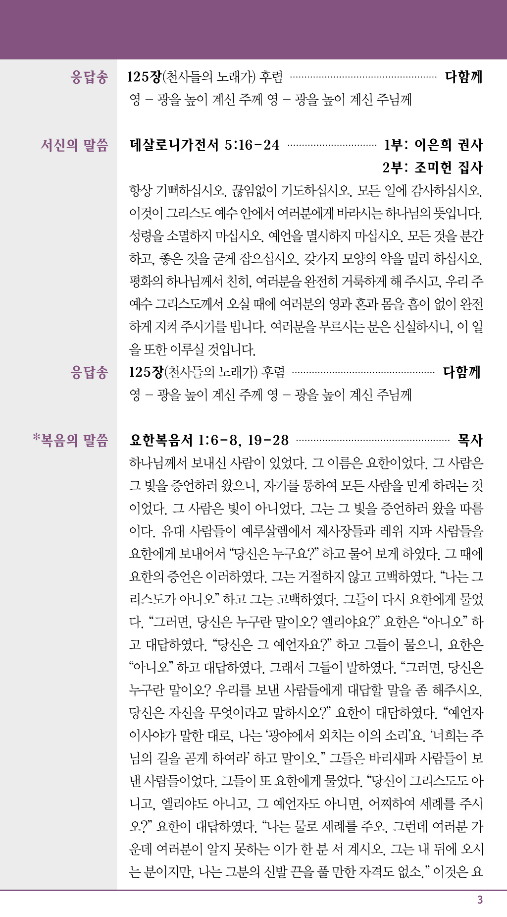 | 성경구절 | 이사야서 61:1-4, 8-11/ 데살로니가전서 5:16-24/ 요한복음서 1:6-8, 19-28 |