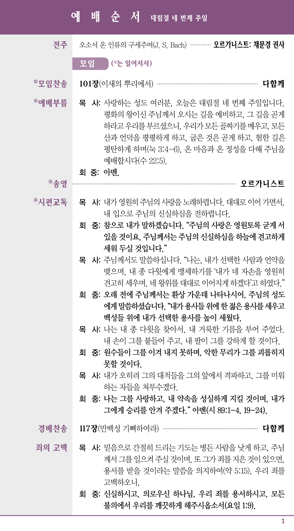 | 전주 | 오소서 온 인류의 구세주여(J. S. Bach) |