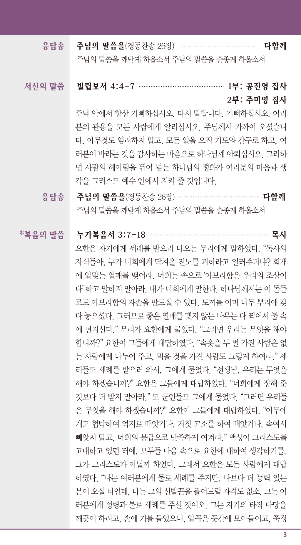 성경구절 스바냐서 3:14-20/ 빌립보서 4:4-7/ 누가복음서 3:7-18